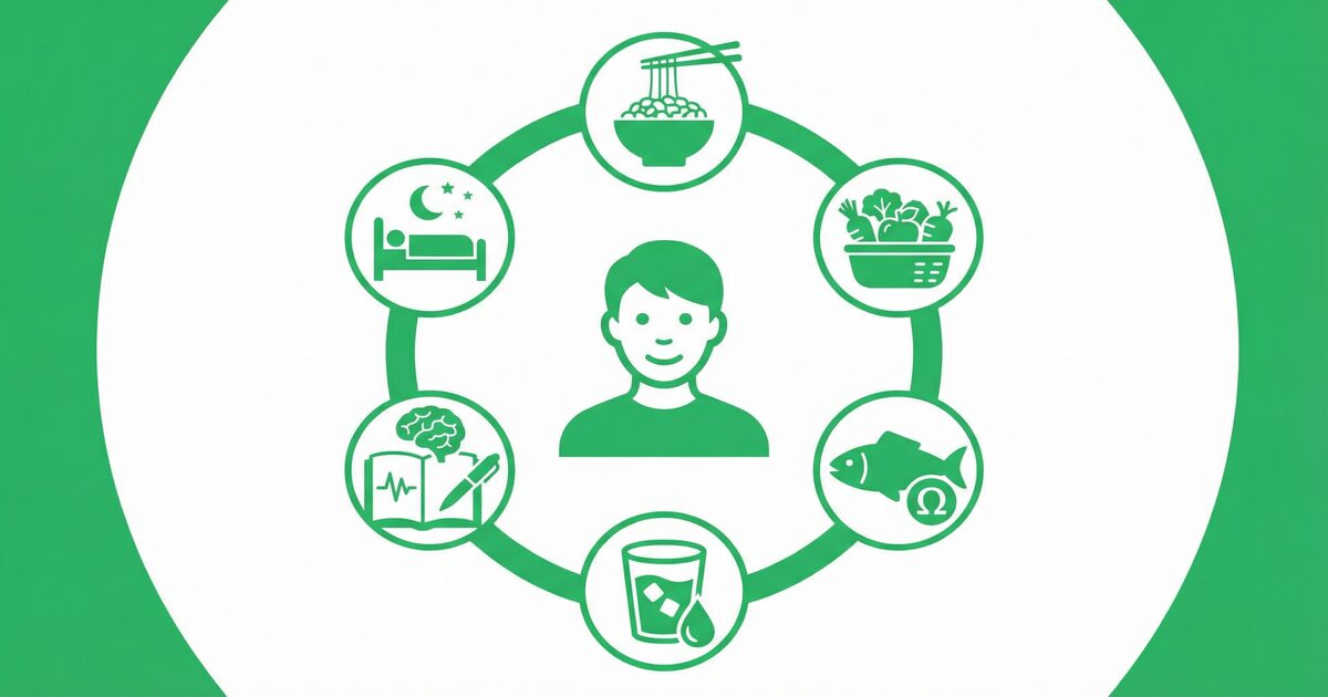 発酵食品と食物繊維が腸内環境を整える → 腸内環境が整うと栄養の吸収効率が上がる → オメガ3脂肪酸が効率よく働く → 水分が代謝を支える → 食事記録が意識を高める → 良質な睡眠が全てを底上げする。
